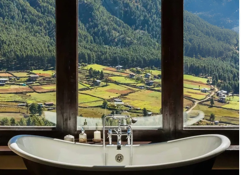 “Gangtey Lodge sits above a mystifying valley of the same name, rife with rolling landscapes, majestic mountains and traditional farmhouses. Each of the 12 lavish guestrooms takes advantage of the magnificent beauty of its surrounding. Facing the beautiful arched frame windows in the bathroom is an English roll-top bath that lets you enjoy the local scenery while in the lap of luxury.”
