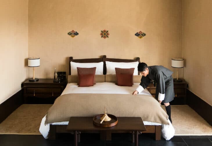 To gaze out at the valley, one severs their connection to time and place. With black-necked cranes above, it only becomes more mystical. Of course, there’s also free, reliable WiFi and so many other amenities that luxury travelers require these days. But the spirituality many speak of when talking about their time in Bhutan can be inhaled here. With it comes peace of mind—and the staff does everything, both seen and unseen, to make sure it’s sustained.